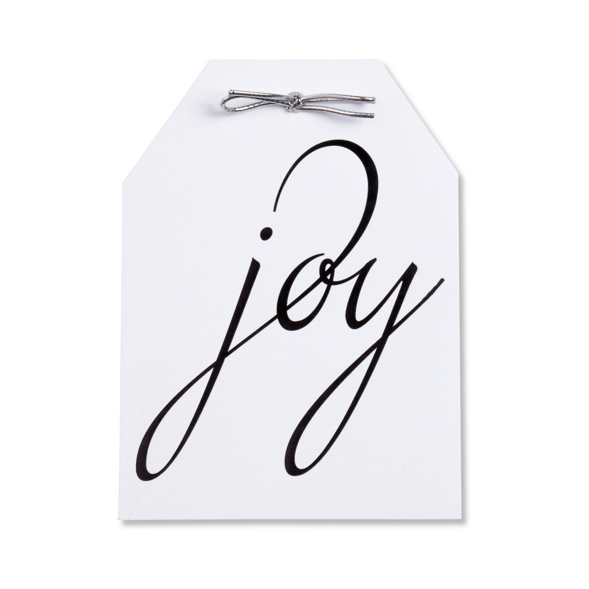 Spread holiday cheer with these 'Joy' gift tags, perfect for Christmas and holiday gift-giving. This set of 10 large tags features black or white foil on white and black paper, adding a stylish touch to your festive presents. Each tag includes a silver tie for easy attachment, making your holiday wrapping effortless and elegant.