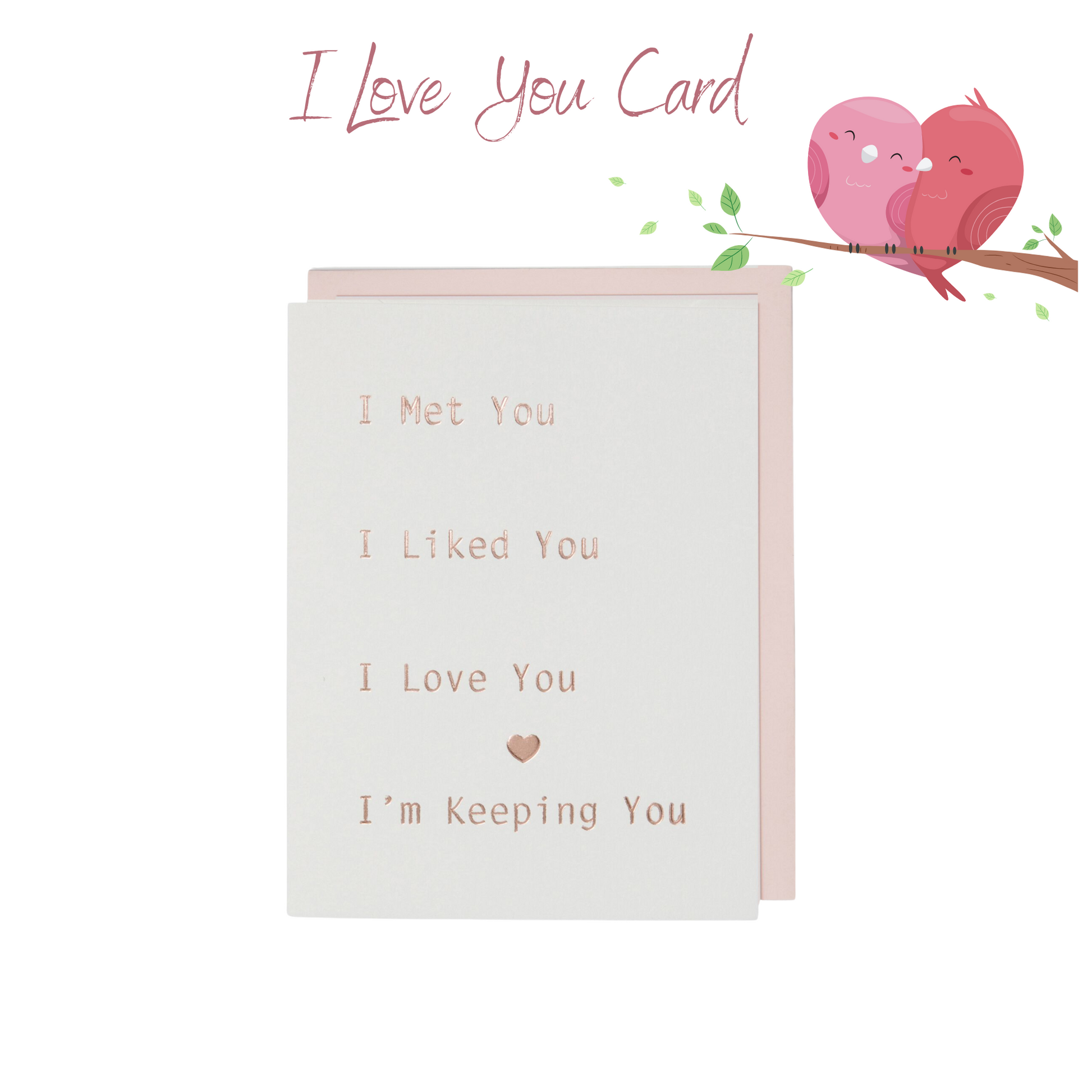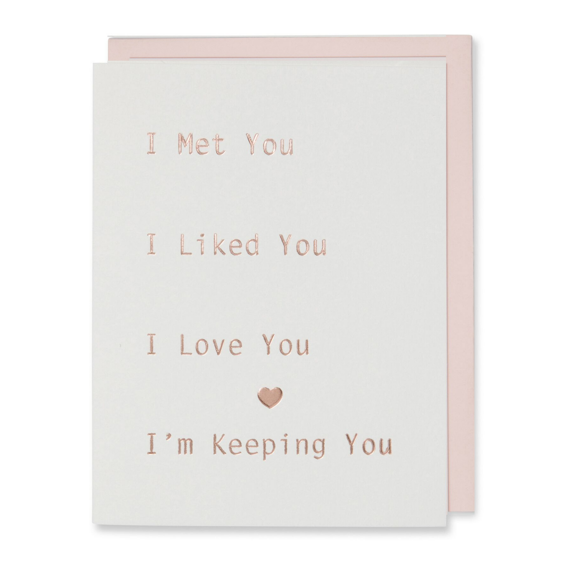 Surprise your loved one with this luxurious "I Met You, I Liked You, I Love You, I'm Keeping You" card. Featuring rose gold foil, it's the perfect way to celebrate your anniversary or Valentine's Day. Let them know how much they mean to you with this sweet and elegant love card.